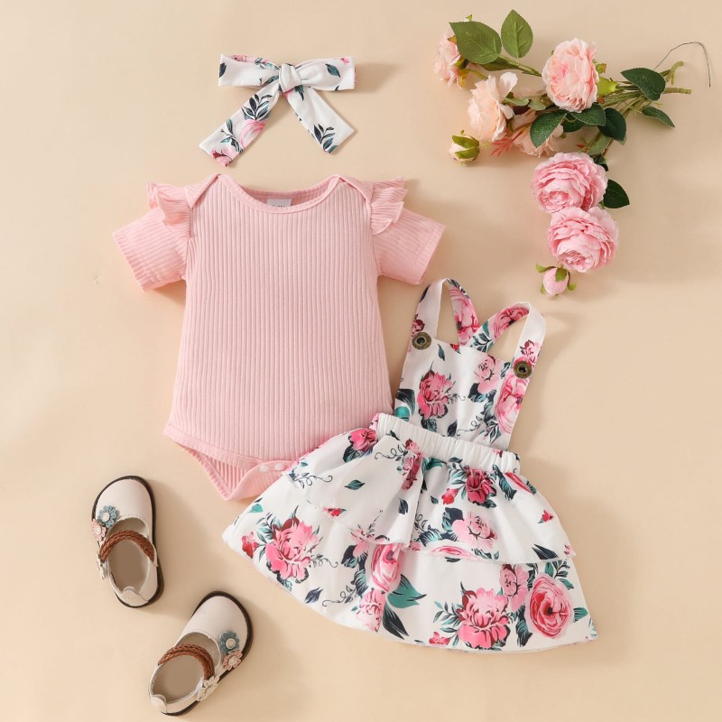 3in1 Pink Ruffle Jumper Floral Overalls +Headband